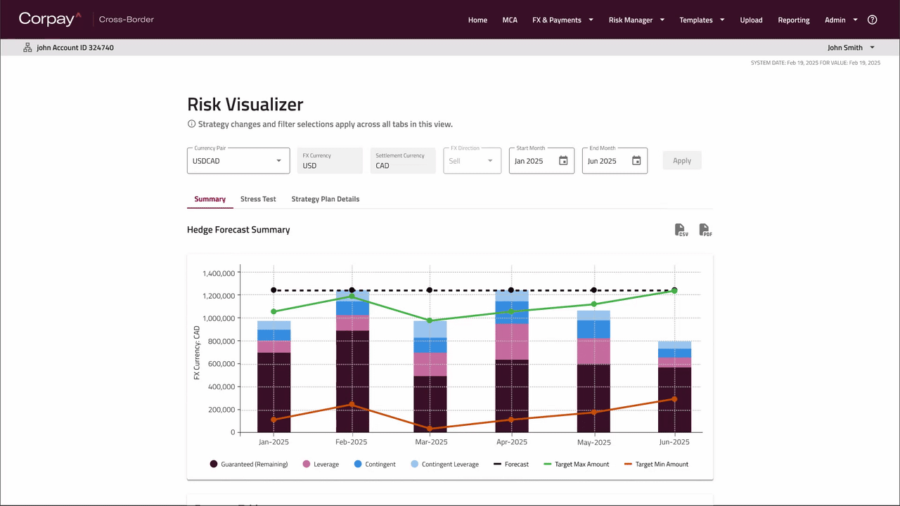 Stress Test was built to let clients explore "what if" scenarios by applying different hedge amounts, rates, or market shifts. Scenarios tested would update in real-time, reflected in the respective forecast chart. This made experimentation feel lightweight and safe, while still offering meaningful insight into how risk would change under different assumptions. The design emphasized clarity, comparison, and reversibility.